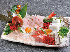 ![]() | 魚処おお田 (伊東・川奈) | 地魚料理に定評。馴染みの漁師の写真や昔ながらの漁の道具が飾られ、港町の風情を伝える。刺身盛り合せ御膳セット。 |